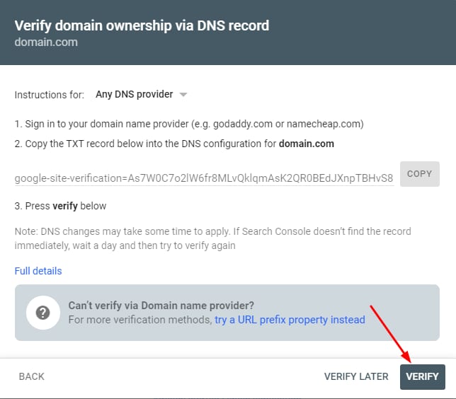 Após alguns minutos, retorne ao Google Search Console e clique em Verificar :