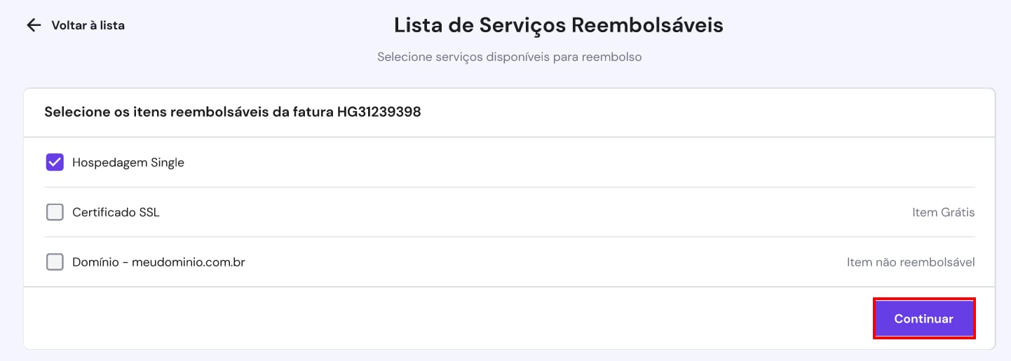 A seguir, você verá a lista de itens da fatura. Selecione os serviços que você deseja reembolsar e clique em Continuar: