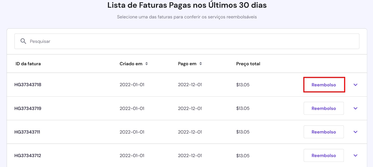 Para iniciar o processo de reembolso automatizado, acesse a página Iniciar solicitação de reembolso em seu hPanel . Ele conterá a lista de faturas pagas dos últimos 30 dias. Selecione a fatura para a qual deseja solicitar o reembolso: