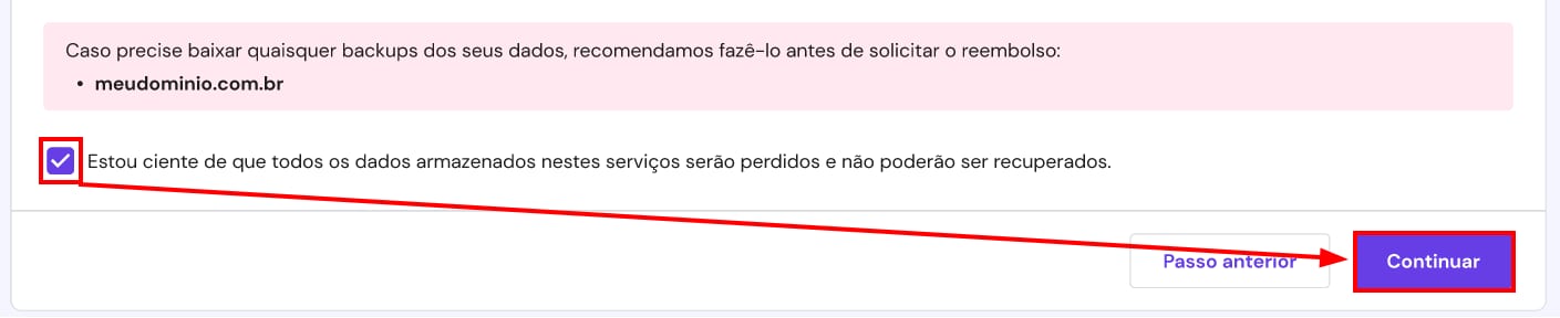 • A solicitação de reembolso não é reversível e todos os arquivos, bancos de dados, e-mails e quaisquer outras configurações serão perdidas. Se você trocar de ideia depois de solicitar o reembolso, você pode comprar um novo serviço e restaurar dos backupos.