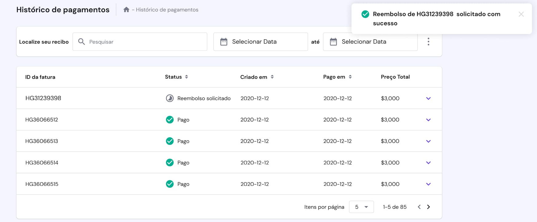 Prontinho! Seu pedido de reembolso foi registrado. Você receberá um e-mail de confirmação. Você também poderá acompanhar seu progresso através da seção Faturas → Histórico de pagamentos: