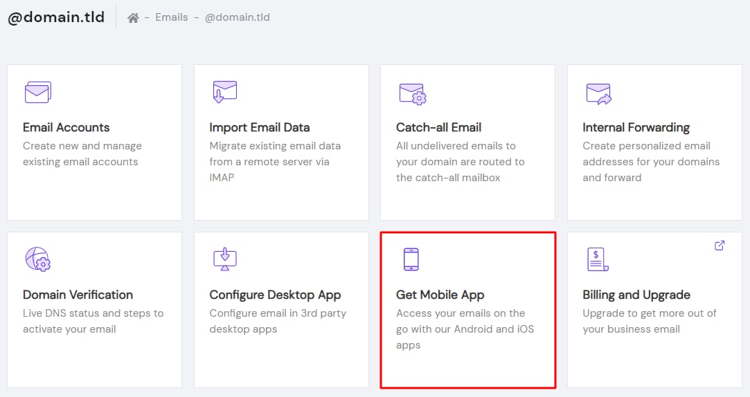 Se você deseja utilizar o E-mail Titan em seus dispositivos móveis ou plataformas externas, acesse a aba de gerenciamento da sua conta de e-mail, e clique em Obter aplicativo móvel:
