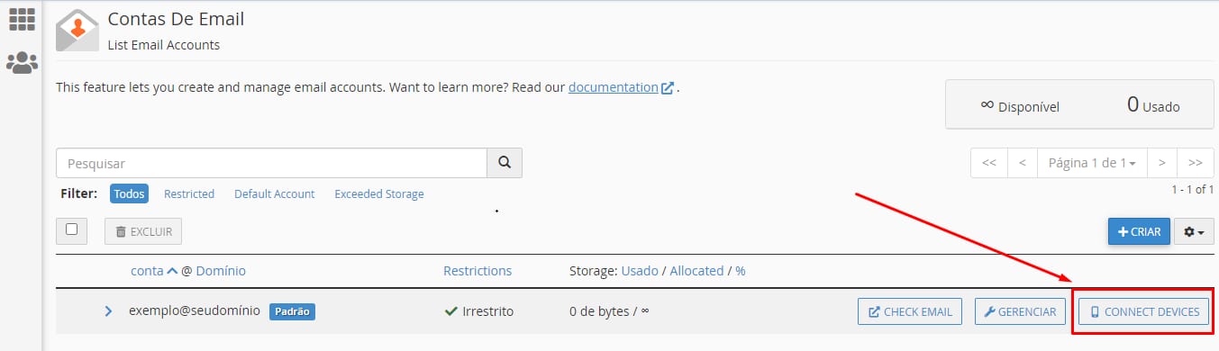 Lá, encontre a conta de email que você vai conectar e clique em Connect devices: