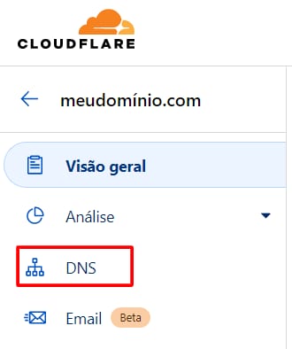 Se você tiver uma conta Cloudflare ativa, poderá gerenciar a zona DNS do seu domínio por meio do painel da Cloudflare. O próximo passo é fazer seu login, selecionar seu domínio e abrir a seção DNS, como mostra a imagem abaixo: