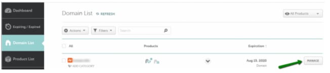 Se seu domínio está registrado com o Namecheap, você pode acessar a sua Zona de DNS navegando pela opção Domain List (Lista de Domínio) e clicando no botão Manage (Gerenciar):