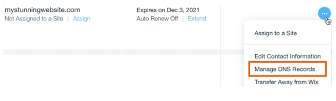 Se seu domínio está registrado no Wix, você pode acessar a Zona de DNS na sua página de Domínio, clicando no ícone Show More (Mostrar Mais) e selecionando a opção Manage DNS Recordos (Gerenciar Registros de DNS):