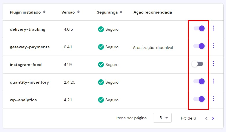 Role para baixo até a lista de plugins instalados , onde você verá todos os plugins atualmente instalados em seu site. Você pode desativá-los um por um clicando no botão de alternância: