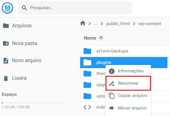 Como desabilitar plugins via gerenciador de arquivos