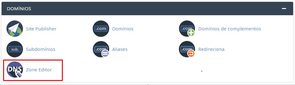 Seus registros MX podem ser facilmente gerenciados com a ajuda da seção Zone Editor, que pode ser encontrada em seu painel de controle. Abra seu cPanel e encontre Domínios → Zone Editor: