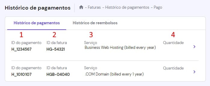 No Histórico de pagamentos, você verá a lista de todos os seus pagamentos anteriores . Você também poderá verificar suas faturas reembolsadas clicando na guia Histórico de reembolsos.