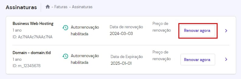 A seção Assinaturas contém uma lista de todos os serviços ativos em sua conta, status de renovação automática e datas de vencimento. Você também pode renovar seu domínio ou hospedagem clicando no botão Renovar agora :