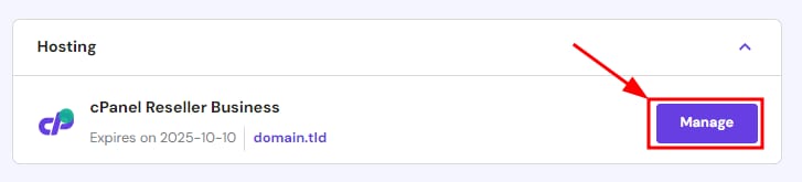 Acesse a página inicial do seu hPanel e clique em Gerenciar ao lado do seu plano de revenda de hospedagem cPanel: