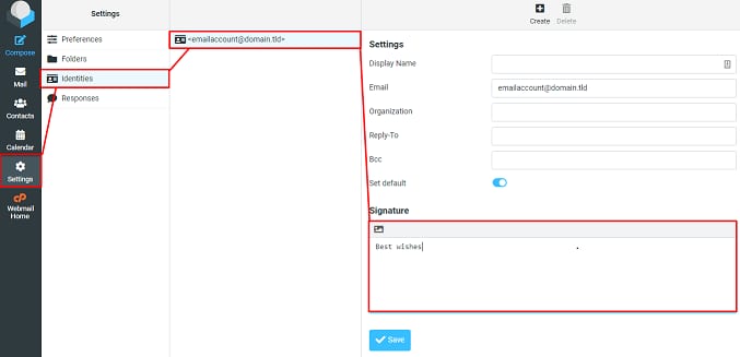 Então basta navegar até as configurações Settings, e selecionar as identidades da conta (Identities). Um novo submenu será exibido e ao fim da tela, você verá o campo para criação da assinatura de e-mail:
