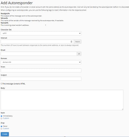 Na seção de Email Auto Responders você poderá configurar respostas automáticas para seus e-mails, selecionar horários específicos para a ativação dessa função, e quando ela deverá deixar de funcionar.