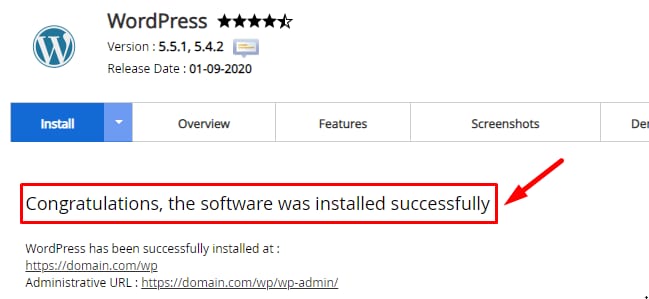 Assim que todas as informações necessárias forem preenchidas, clique em Instalar na parte inferior da página. O Softaculous fará a instalação para você, e você verá uma mensagem de sucesso assim que a instalação for concluída: