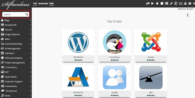 Quando estiver no Softaculous, você pode escolher entre uma variedade de aplicativos, escolhendo a partir das diferentes categorias, ou simplesmente pesquisar o aplicativo que deseja usar na seção Search: