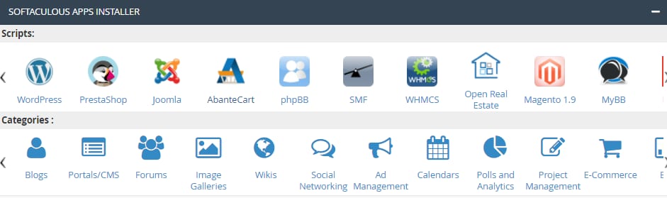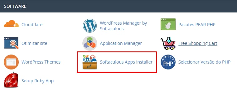 Instalar aplicativos automaticamente é bem fácil, basta acessar seu cPanel e clicar na seção Softaculous Apps Installer: