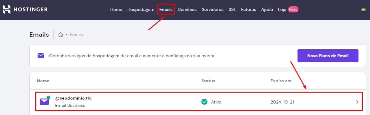Você pode facilmente comprar caixas de e-mail adicionais para o e-mail Titan abrindo a seção de Emails e selecionando o seu domínio: