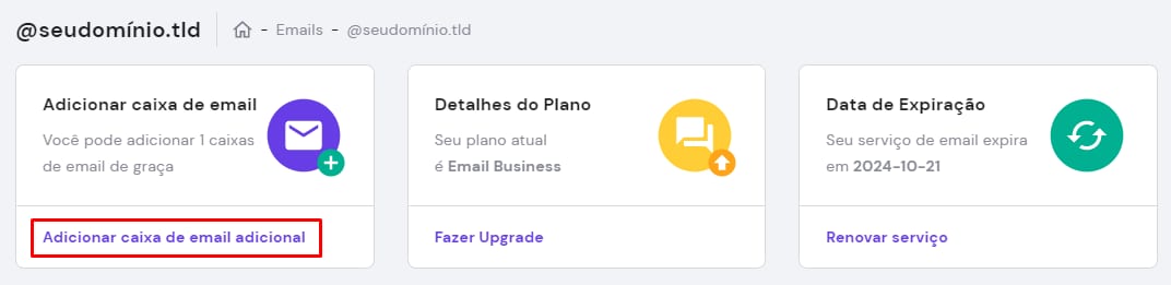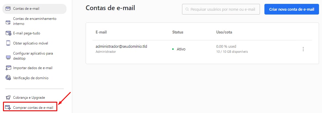 Ou então, você pode clicar em Comprar contas de e-mail, na seção de gerenciamento da sua conta de e-mail:
