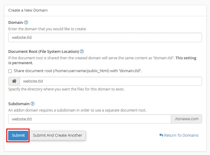 Subdomínio: especifique um subdomínio dentro do domínio principal. É necessário ter a raiz de documento separada e é recomendado deixar o valor padrão