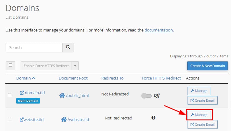 Você também poderá remover e gerenciar seus domínios adicionais na parte inferior da página: