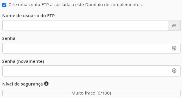 Você também pode criar uma conta FTP separada para o seu novo domínio ao longo do caminho, tudo o que você precisa fazer é selecionar a opção FTP, escolher um nome de usuário e senha de FTP: