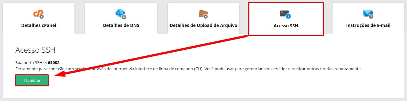 Se você possui um de nossos Planos de Hospedagem Compartilhada cPanel, o SSH para a conta principal de seu Plano de Revenda cPanel, basta acessar sua conta em Início → Gerenciar, ao lado do seu plano cPanel. Em seguida, clique em Acesso SSH e selecione Habilitar: