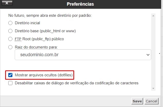 2. Marque a opção Mostrar arquivos ocultos (dotfiles) e salve: