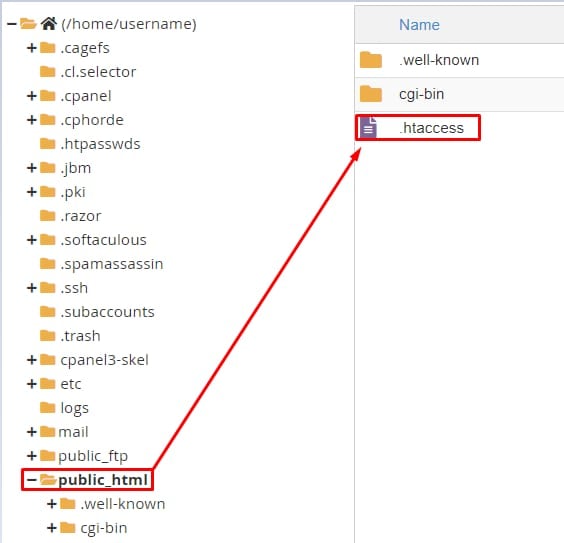Se você não encontrar seu arquivo .htaccess dentro de seu Gerenciador de arquivos, ele pode estar oculto em public_html por padrão. Para ver os arquivos ocultos em seu gerenciador de arquivos no cPanel, siga estas etapas:
