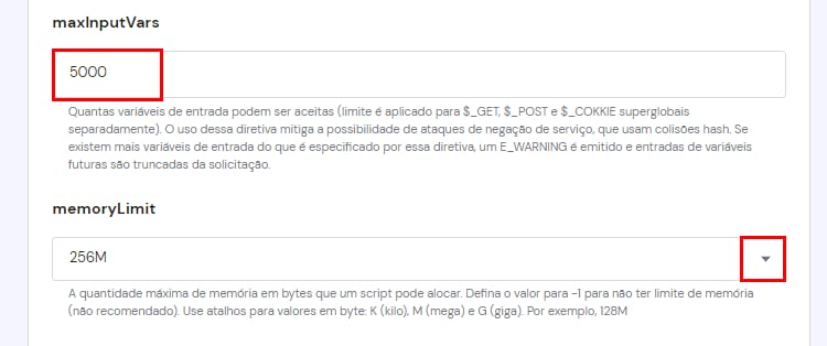 Você só pode definir valores iguais ou inferiores aos do limite do seu plano de hospedagem. Se o número definido for maior, os parâmetros serão ajustados automaticamente para o valor máximo do seu plano;