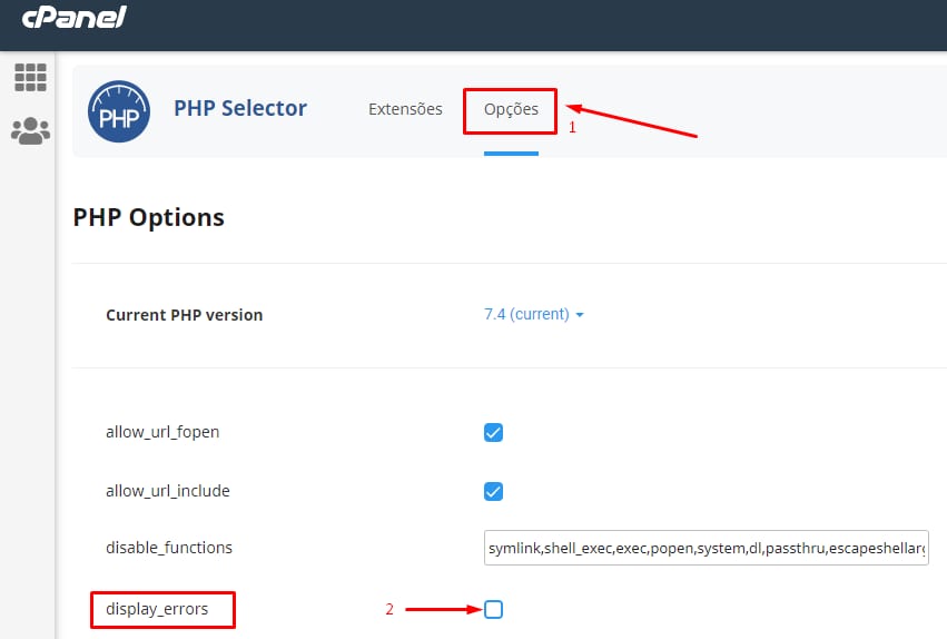 Na página em questão, selecione a aba Opções, e então, um pouco mais abaixo na sua tela, selecione a opção de display_errors:
