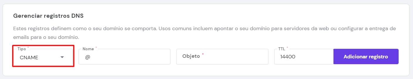 Nome é o nome do host do registro, sem o nome do domínio. Isso geralmente é conhecido como “subdomínio”. Anexamos automaticamente o nome do domínio.