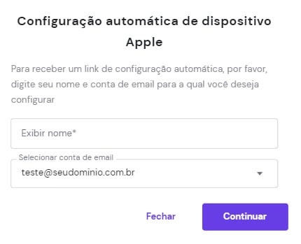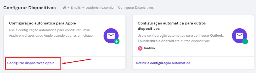 Abra o menu de E-mails → nome de domínio → Configurar Dispositivos – lembre-se de fazer isso utilizando o navegador Safari (já que em outros navegadores o perfil não será baixado corretamente):
