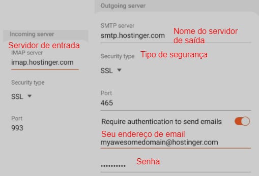 Host: smtp.hostinger.com Criptografia: SSL/TLS Porta: 465 |