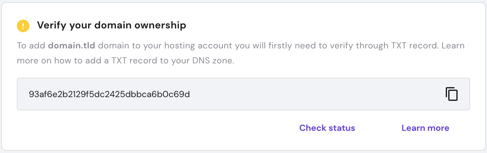 Por motivos de segurança, você deve ser proprietário de um domínio para poder usá-lo com os serviços da Hostinger. Se o seu domínio estiver registrado em uma outra conta da Hostinger – não na mesma conta em que está sue plano de hospedagem – tudo que você precisa fazer é adicionar um registro TXT para verificar a propriedade do domínio.