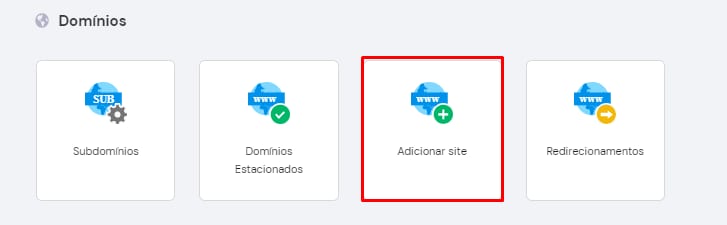 Se o seu domínio ainda não está adicionado na conta de hospedagem, acesse seu painel de Hospedagem e clique em Adicionar site:
