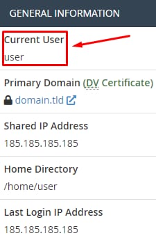 Você também pode verificar seu nome de usuário do cPanel acessando seu painel de gerenciamento cPanel. Uma vês lá, o nome é mostrado na barra da direita na coluna de Informações Gerais: