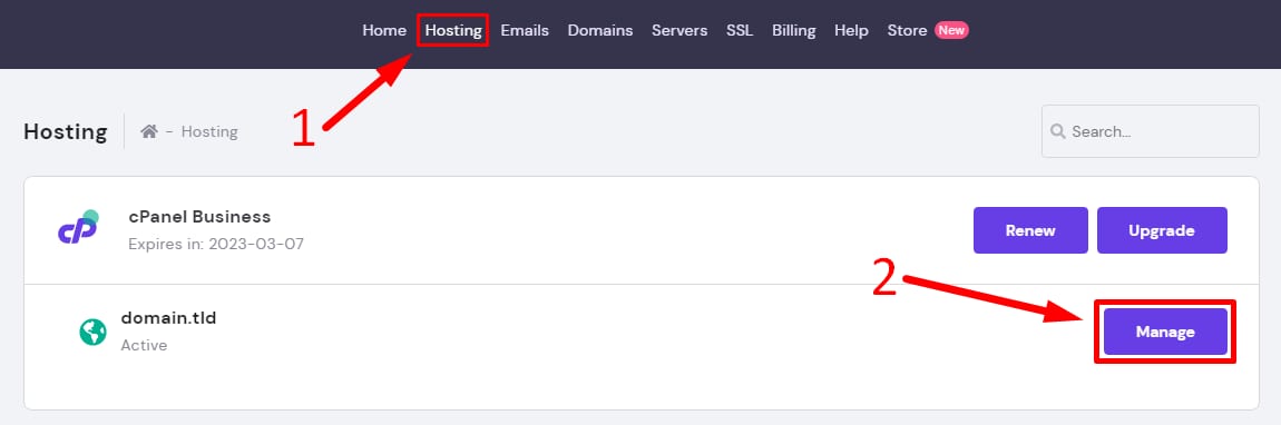 Você pode encontrar seu nome de usuário abrindo a aba Hospedagem → Gerenciar: