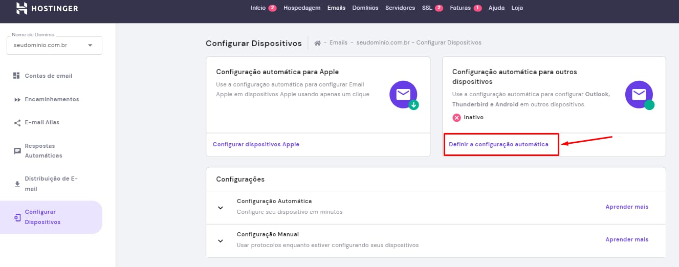 Se o seu domínio estiver apontar para os servidores DNS (nameservers) da Hostinger, basta clicar em Definir Configuração Automática: