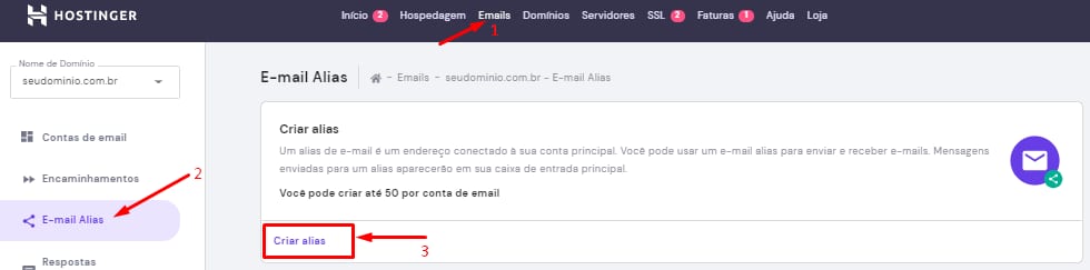 Para criar um alias para seu e-mail, abra o menu E-mails → nome de domínio → E-mail Alias. Quando estiver na página em questão, clique Criar Alias: