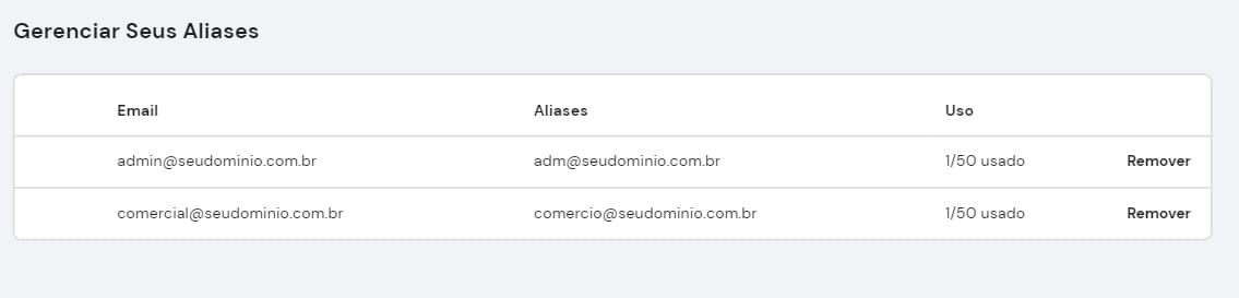 Você verá todos os e-mails alias criados nesta mesma página, na seção Gerenciar Seus Aliases: