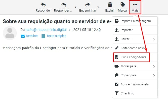 Para verificar os cabeçalhos dos e-mails, tudo que você precisa fazer é entrar no Webmail, clicar no e-mail em questão que você deseja investigar, então clicar em Mais e Exibir código-fonte: