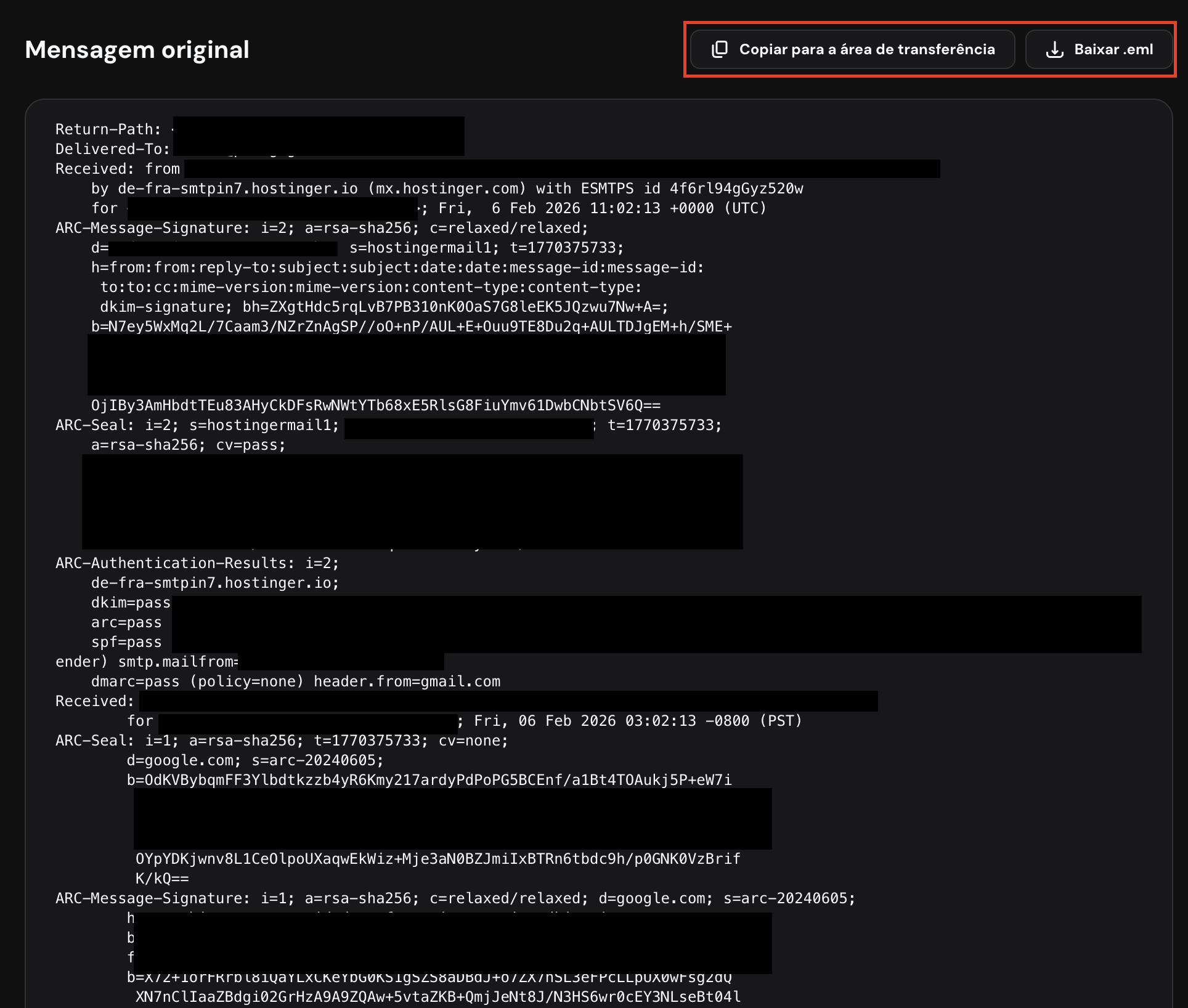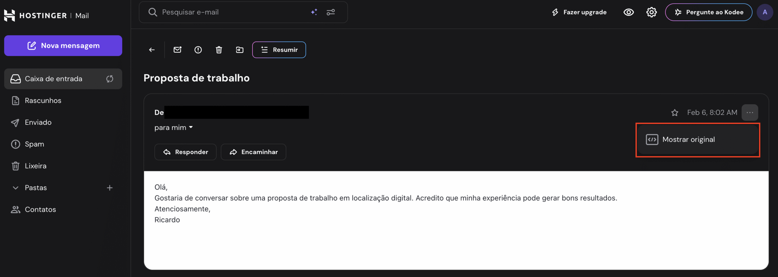 Opção 1: Verificar cabeçalhos no webmail do Hostinger Mail.