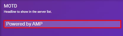 A Mensagem do Dia (MOTD) pode ser facilmente atualizada a qualquer momento. Para atualizá-la, basta fazer o login no Game Panel, abrir a página de gerenciamento da sua instância, abrir Configuration (Configuração) → menu Minecraft. Na página você encontrará a opção de atualizar a MOTD: