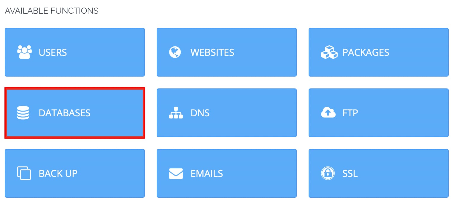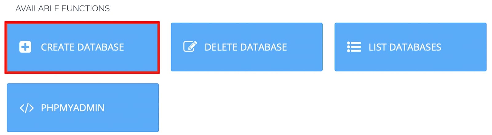 Para criar um banco de dados, localize a seção de funções disponíveis (Available functions) e clique em Databases: