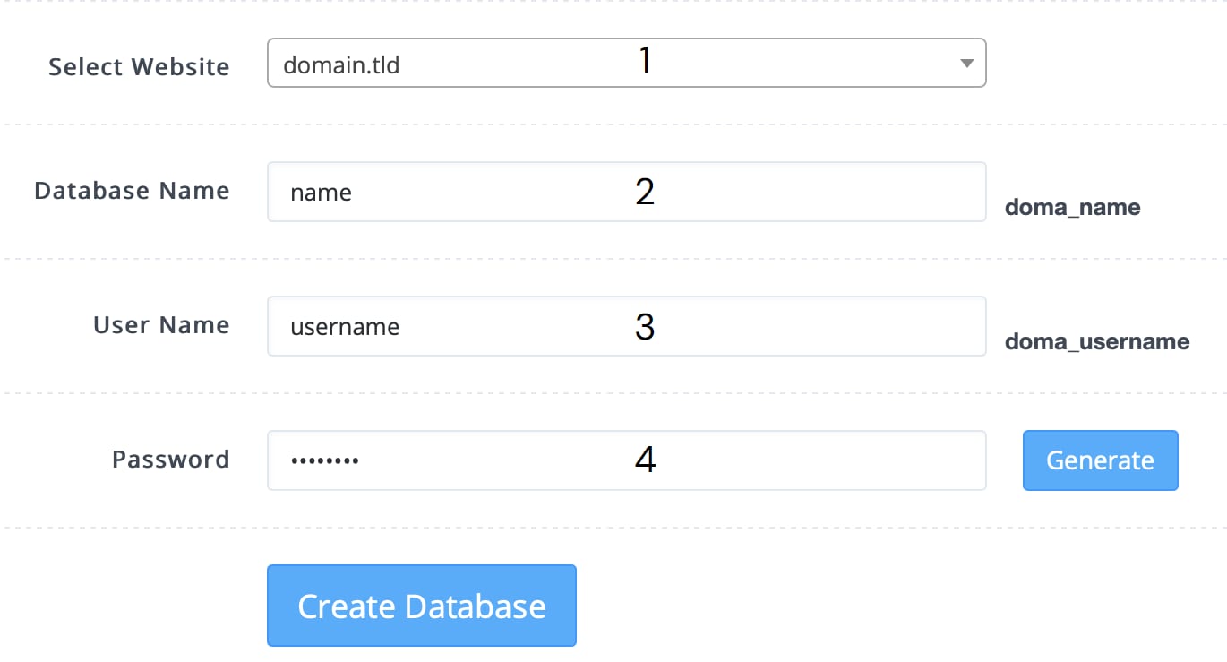 Select Website: insira o domínio para o qual você deseja criar o banco de dados