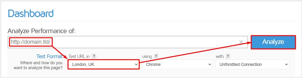 Para testar um site, acesse o GTmetrix.com, digite seu nome de domínio, selecione o servidor do teste (opção disponibilizada quando você entrar em sua conta), e configure outros parâmetros, se desejar. Então clique em Analyze: