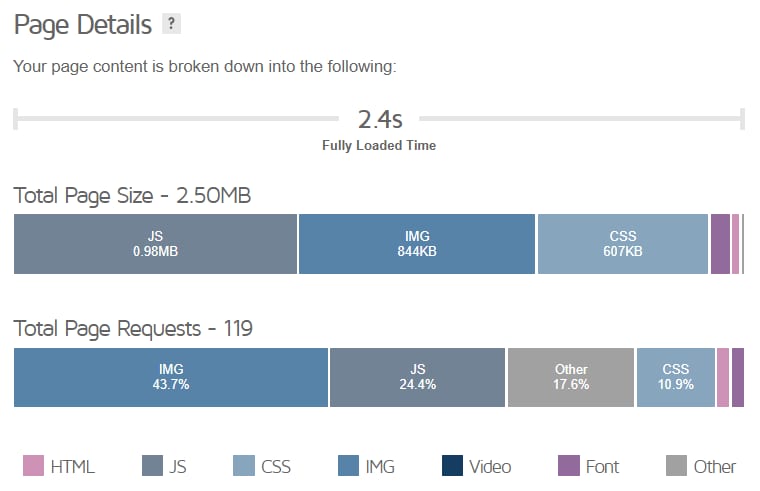 Por fim, temos as seções de fully loaded page time (tempo de carregamento completo da página) e total page size (tamanho total da página), que podem ser encontradas ao final da página do relatório: