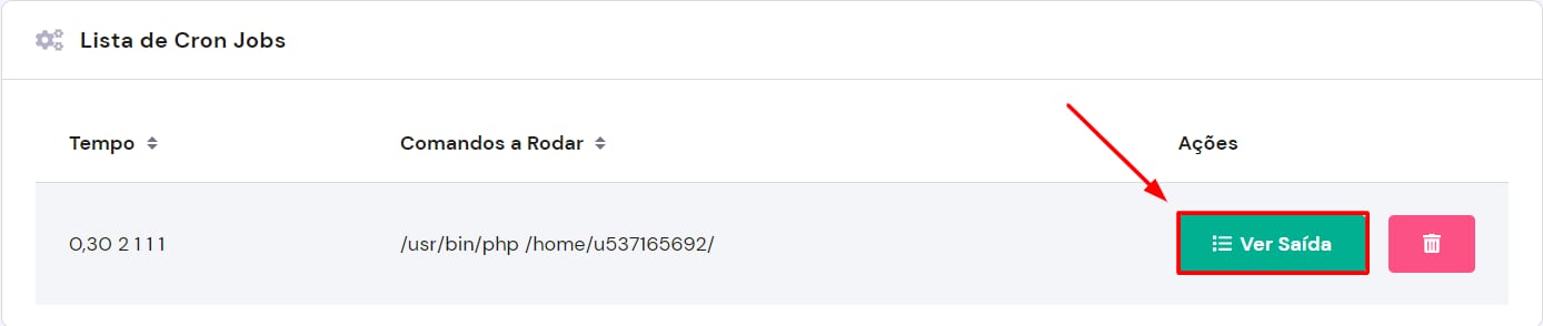 Depois de criar a sua Cron Job no hPanel, você verá a seção Lista de Cron Jobs. Para verificar os resultados da saída, aguarde a Cron Job ser executada (ela será executada com base no agendamento predefinido por você) e clique em Ver saída, como mostra a imagem abaixo: