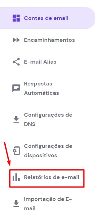 Para abrir o Relatório de acessos, basta navegar por qualquer uma das suas contas de e-mail da Hostinger e clicar em Relatórios de e-mail do lado esquerdo da página, como mostra a imagem: